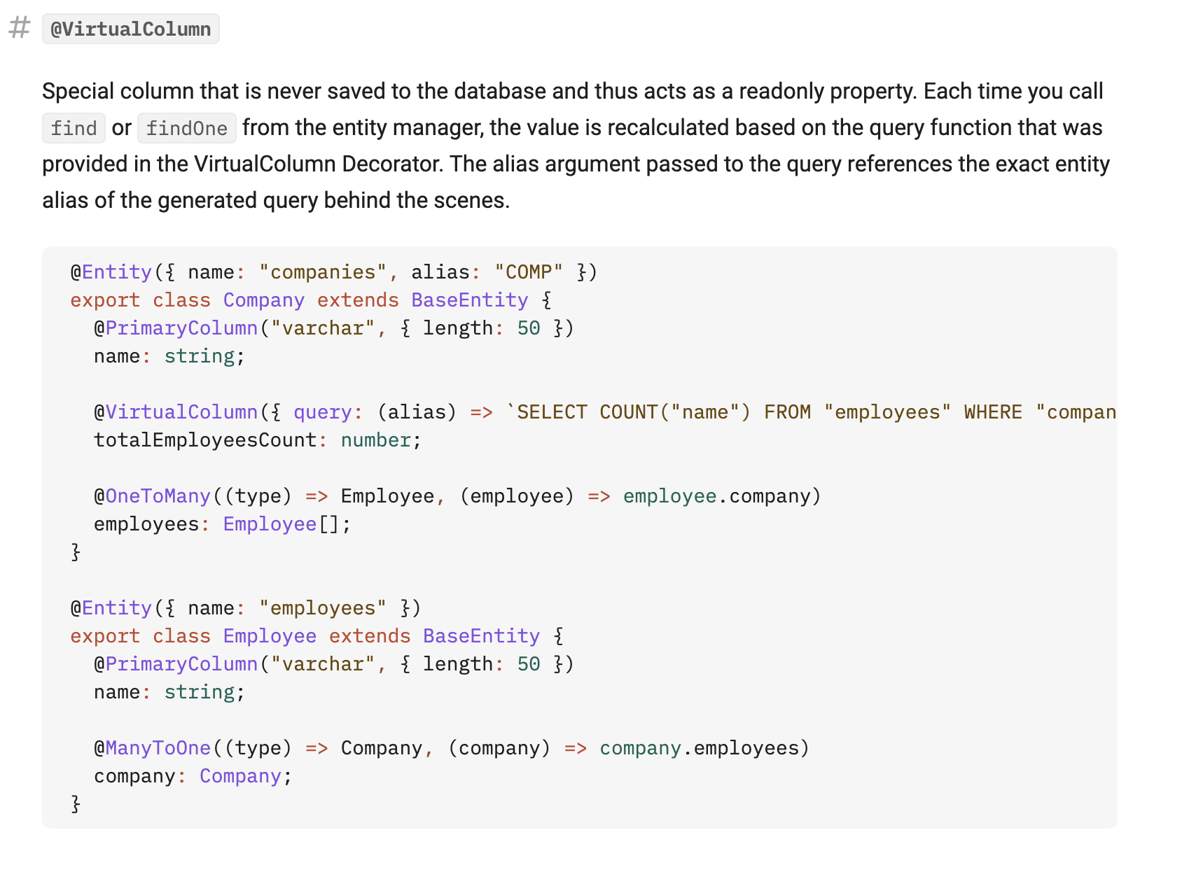 쿼리 결과를 코드에서 사용하기 위해 ORM을 통해 객체로 변경할 때, 미묘한 어긋남이 발생할 때가 있다.예를 들어, 어떤 게시판의 게시글 중 유저별로 북마크했는지 안했는지 여부를 나타내야할 때, 이 값은 게시글 엔티티의 칼럼에 저장하기 보다는 그때 그때 계산하는 것이 좋을 것이다.DB에 저장된 값이 아닌 계산된 값을 사용해야할 때 TypeORM에서는 @VirtualColum 데코레이터를 제공한다.위 방법은 내가 구하고자 하는 값이 이미 DB 내부의 정보들로 결정되는 값일 경우에만 사용할 수 있다는 단점이 있다. 즉, 회사의 직원 수를 나타내는 칼럼은 코드 내부에서 값을 매번 업데이트하기보다 요청 시에 Count 쿼리를 통해 그때그때 확인할 수 있다면 해당 데이터에 대한 신뢰도가 올라갈 것이다. 앞에서 예..